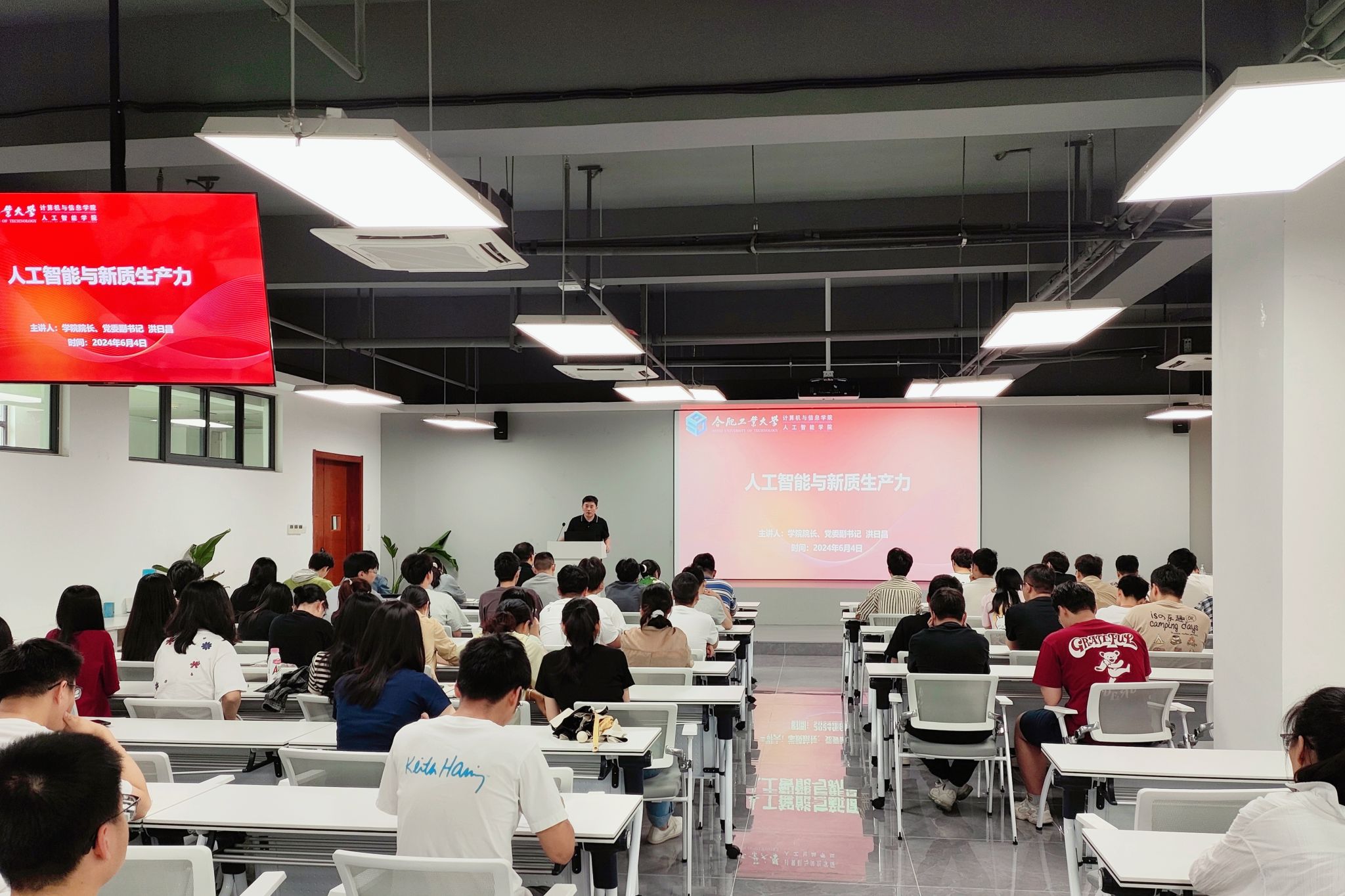 6月4日,开云kaiyun登录入口在翡翠科教楼B座501会议室举办“人工智能与新质生产力”主题党课,学院院长洪日昌受邀主讲,全体研究生党员参加学习。