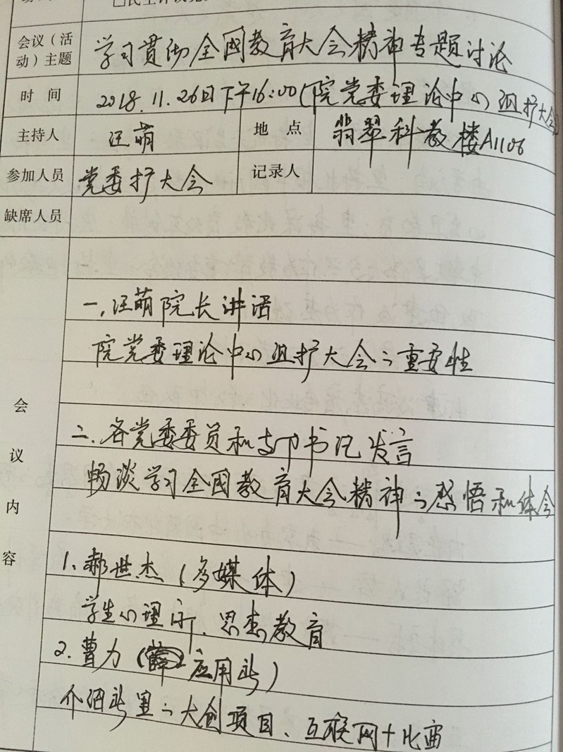 2018年11月26日下午,在开云kaiyun登录入口会议室召开学院党委理论中心组扩大会议,会议由院长汪萌主持,院党委书记、各党委委员和各党支部书记参会。