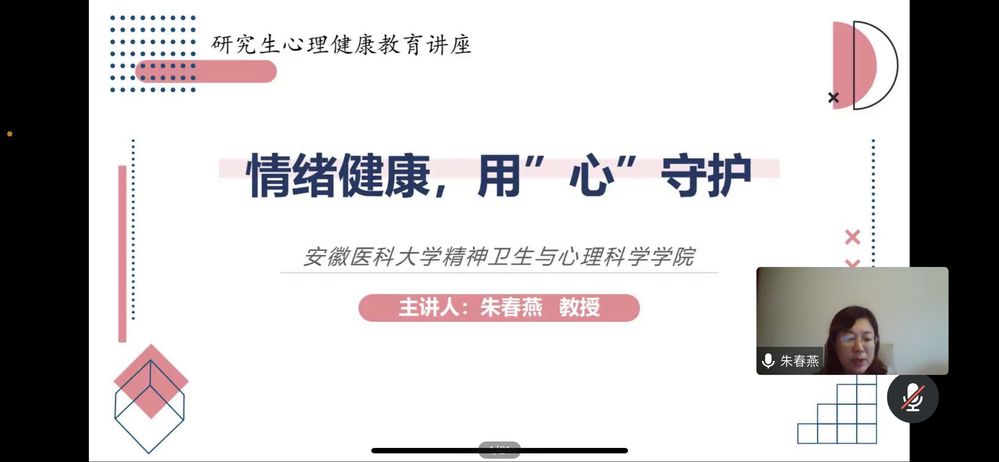 为进一步加强疫情期间在校同学的心理健康教育,帮助同学们做好心理调适,缓解心理压力和焦虑情绪,切实保障研究生阶段学习生活的身心健康,2022年11月2日下午“斛兵研学”第八期——“适应、转型与成长”研究生新生心理适应性专题讲座于线上顺利开展,本次活动由开云kaiyun登录入口研究生会承办,安徽医科大学精神卫生与心理科学学院副院长朱春燕教授应邀担任主讲,该院学工办主任兼团委书记、研究生辅导员黄晨、研究生会学生骨干进行线下会场,近三百名研究生新生参加线上会场,讲座由研究生辅导员黄鹏飞主持。