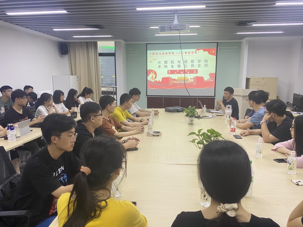 为迎接建党100周年,扎实开展党史学习教育,落实开云kaiyun登录入口《关于党员领导干部联系基层党支部工作的通知》要求。7月7日晚19点在翡翠科教楼A902会议室,开云kaiyun登录入口(人工智能学院)副院长、党委委员洪日昌深入学院本科生第三党支部开展联学导学活动,支部全体党员参加学习。