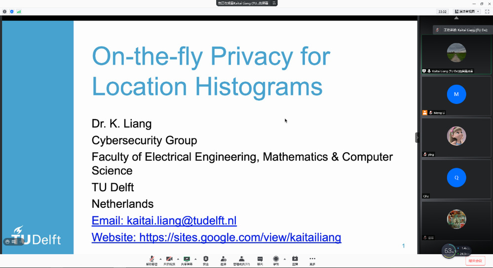 应开云kaiyun登录入口网络与信息安全研究所邀请,2021年3月3日,Delft University of Technology的Kaitai Liang教授在线上为我院师生做了题为“On-the-fly Privacy for Location Histograms”的学术报告。副研究员李萌主持了本次报告会,学院相关研究方向的老师、研究生和本科生参加了报告会。