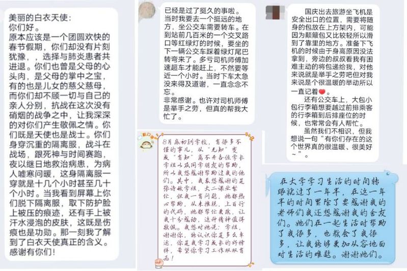 本次话题留言互动活动通过先锋志愿中心QQ公众号平台进行开展。活动期间,同学们热心留言,叙述身边的人对自己的帮助,表达未能说出的感谢。或是对热心解答问题的学姐的感谢,或是对心怀善意的司机师傅的感恩,或是对日日相伴的室友的感恩,抑或是那句“当我看到屏幕上你们脱下隔离服,取下防护脸上被压的痕迹,还有手上被汗水浸泡的皮肤,这既是伤痕也是功勋。那一刻我了解到了白衣天使真正的含义。”……句句肺腑之言着实令人感动!先锋志愿中心公众号帮忙转达这份感动,传递这份温暖,让雷锋精神以生动的、实质化的方式传递着,让更多的人感受到世界上平凡却伟大的爱。