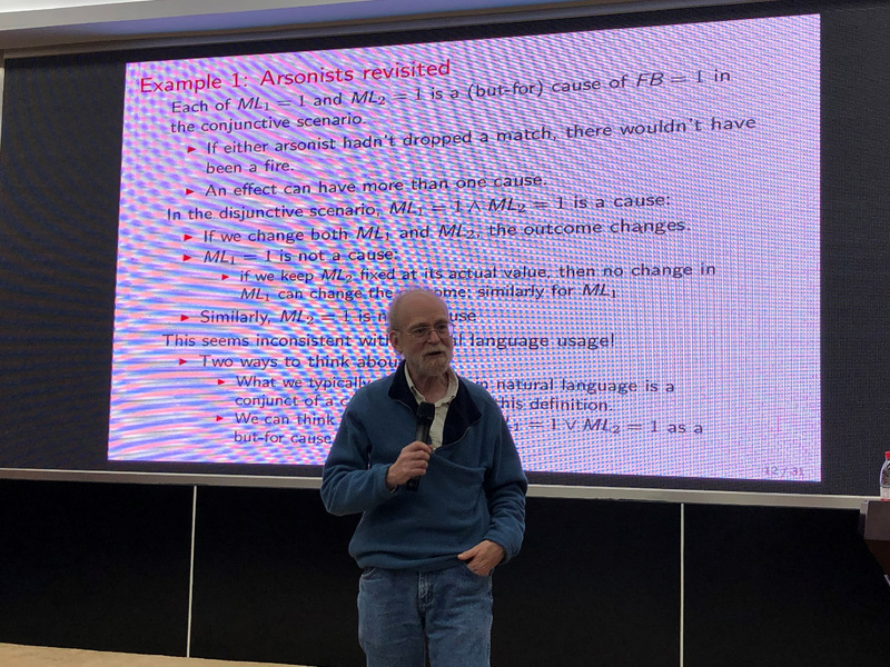 2019年11月13日下午,美国康奈尔大学(Cornell University)计算机学院Joseph Halpern教授来我校开云kaiyun登录入口访问,并在翡翠科教楼A楼第四会议室做了题为“Actual Causality: A Survey”的学术报告。开云kaiyun登录入口王浩教授、安宁教授、俞奎教授、吴共庆老师、李培培老师、李磊老师、吴克伟老师、杨矫云老师、吴乐老师、胡珍珍老师等与学院相关专业硕博士研究生共计八十多人参加了报告会。
