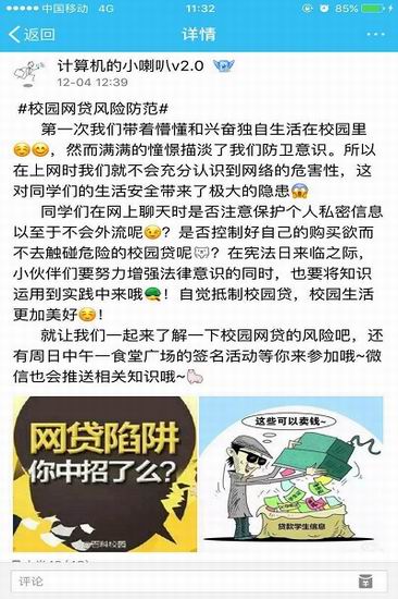 重视“校园网贷”网络思想教育。充分发挥学院新媒体平台融合优势,通过我院青年新媒体中心,充分利用QQ“计算机的小喇叭”、官方微信等线上平台推送主题教育图片、不良校园网贷案例,线上“倡导科学理性消费 远离不良校园网贷”倡议活动,学生即时查看并互动参与,引导学生理性消费,科学消费,自觉抵制不良网贷。