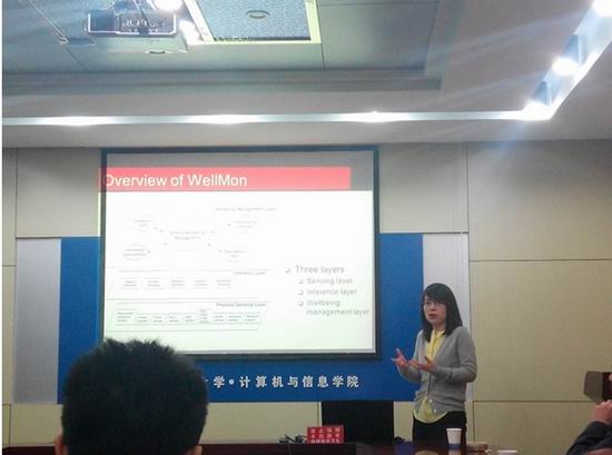 20日上午10点,张燕咏教授在逸夫楼408会议室做了题为“Wellbeing Monitoring of Older Adults Using Unobtrusive Sensing Methods”的学术报告。报告会由杨学志副院长主持,参加此次学术报告的有邵堃老师、开彩红老师、杨静老师等,张燕咏教授的报告主要介绍了如何通过仔细设计基于物联网的可扩展的、分层信息体系结构WellMon来监控老人整体的身心健康,以帮助老人安度晚年、降低家庭的养老成本。