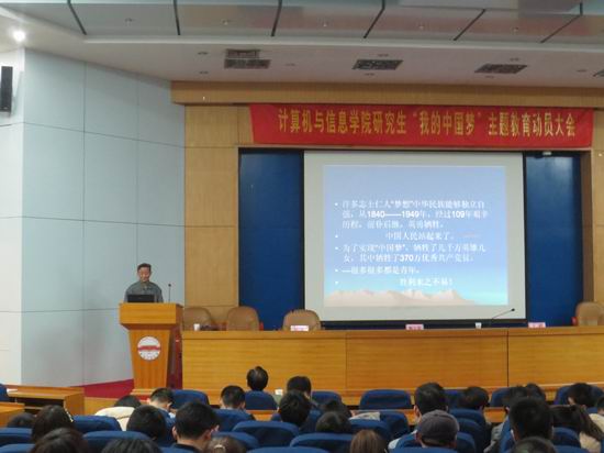 大会一开始由我院党委副书记何庆领老师宣读关于“我的中国梦”主题教育动员,接着蒋建国书记给同学们介绍了“我的中国梦”活动的背景并指导大家将个人,民族,国家之梦结合起来。王峰部长则是跟大家共享了他自己对于“我的中国梦”的理解:中国梦是一种信仰。听了领导们的发言,同学们很受启发。紧接着吴挺老师宣布了我院关于“我的中国梦”主题活动的安排包括报告会,演讲比赛等七个活动。