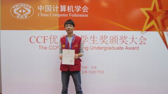 由中国计算机学会(CCF)主办的2012中国计算机大会(CCF CNCC)于10月18-20日在大连举行。我院代表2011级本科生、CCF开云kaiyun登录入口学生分会主席王琪和2010级本科生易鑫参加了本次大会,其中易鑫荣获了CCF颁发的“CCF优秀大学生奖”。
