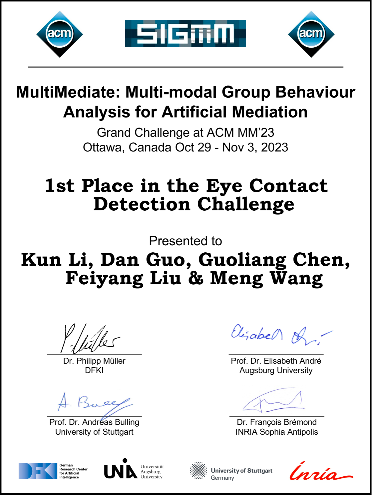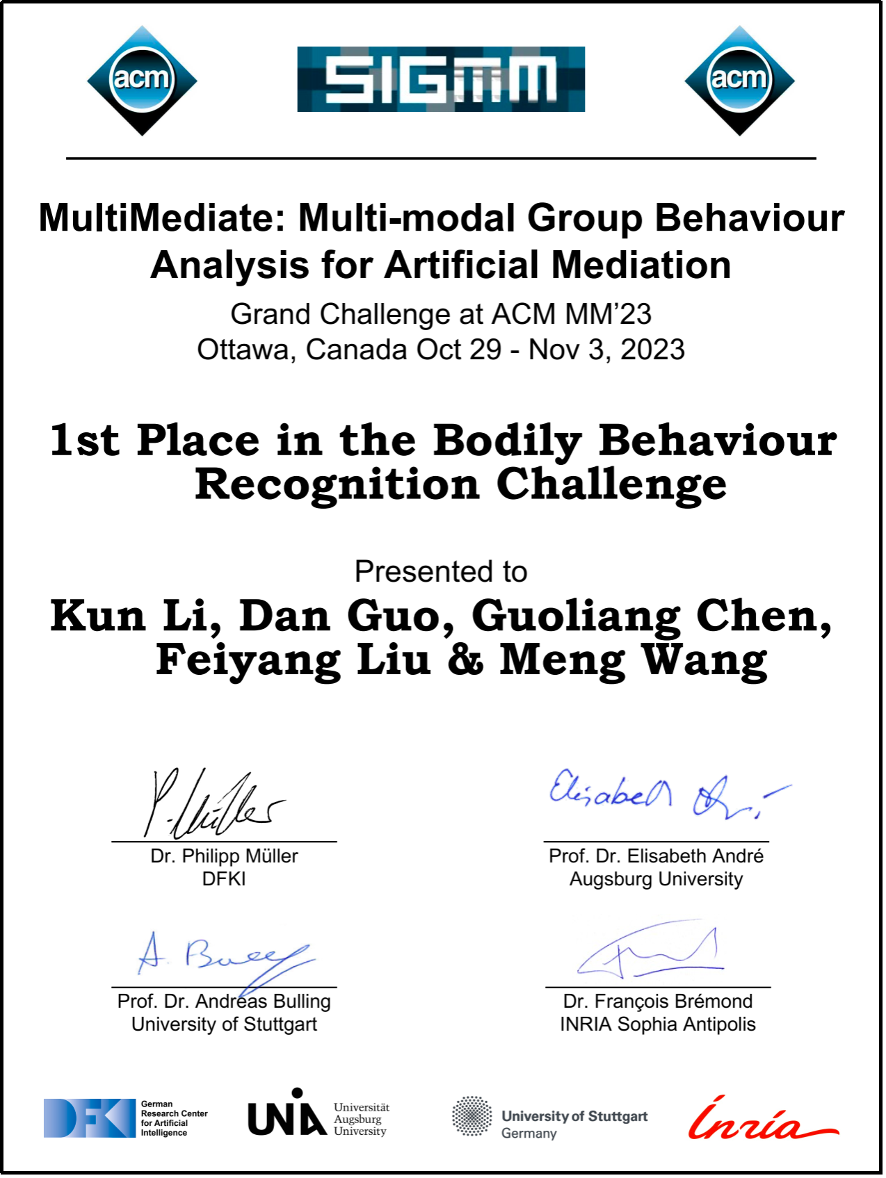 开云kaiyun登录入口多媒体计算实验室团队由汪萌教授带队,在郭丹教授的指导下,由李坤、陈国良、刘飞扬等硕博研究生组成参赛队伍,在身体行为识别赛道以及眼神接触检测赛道斩获双赛道冠军,针对动作识别问题提出了一种有效的数据增强学习方案,在复杂的多类别身体行为识别和眼神接触检测中取得优异性能,获得双赛道第一名;团队在会议上发表论文,并在线介绍了相关的工作。