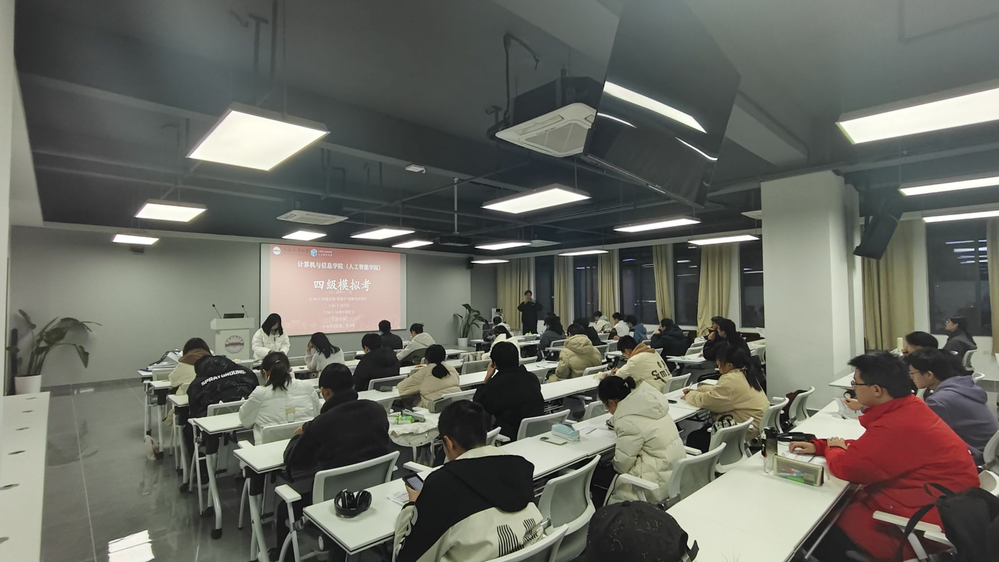 本次模拟考试严格遵循全国大学英语四级考试的标准流程,内容包括听力、阅读、写作和翻译四个部分,全面模拟了真实考试的各个环节,目的是使考生在实战中锻炼自我,提高应试技能。根据考试安排,工作人员有序引导考生进入考场就座。18点55分,考场工作人员准时分发试卷和答题卡,并向考生说明了考场注意事项,例如各部分答题时间限制以及听力部分结束后立即收取答题卡等。19点整,模拟考试正式启幕。考试期间,考场秩序井然,同学们专注作答,充分展现了学生对待此次模拟考试的认真态度。考试结束后,工作人员统一收集试卷,考生们有序离开考场。